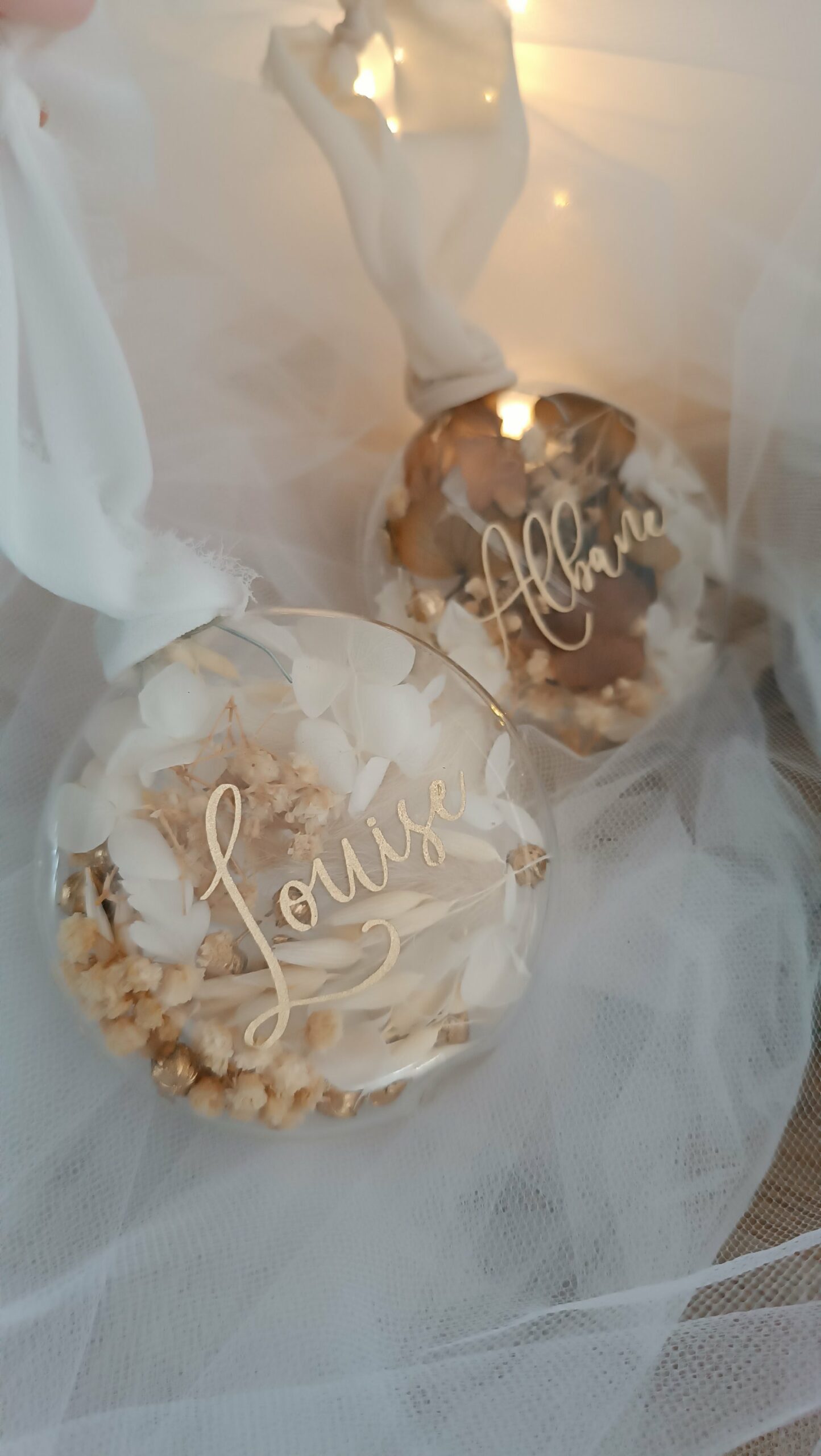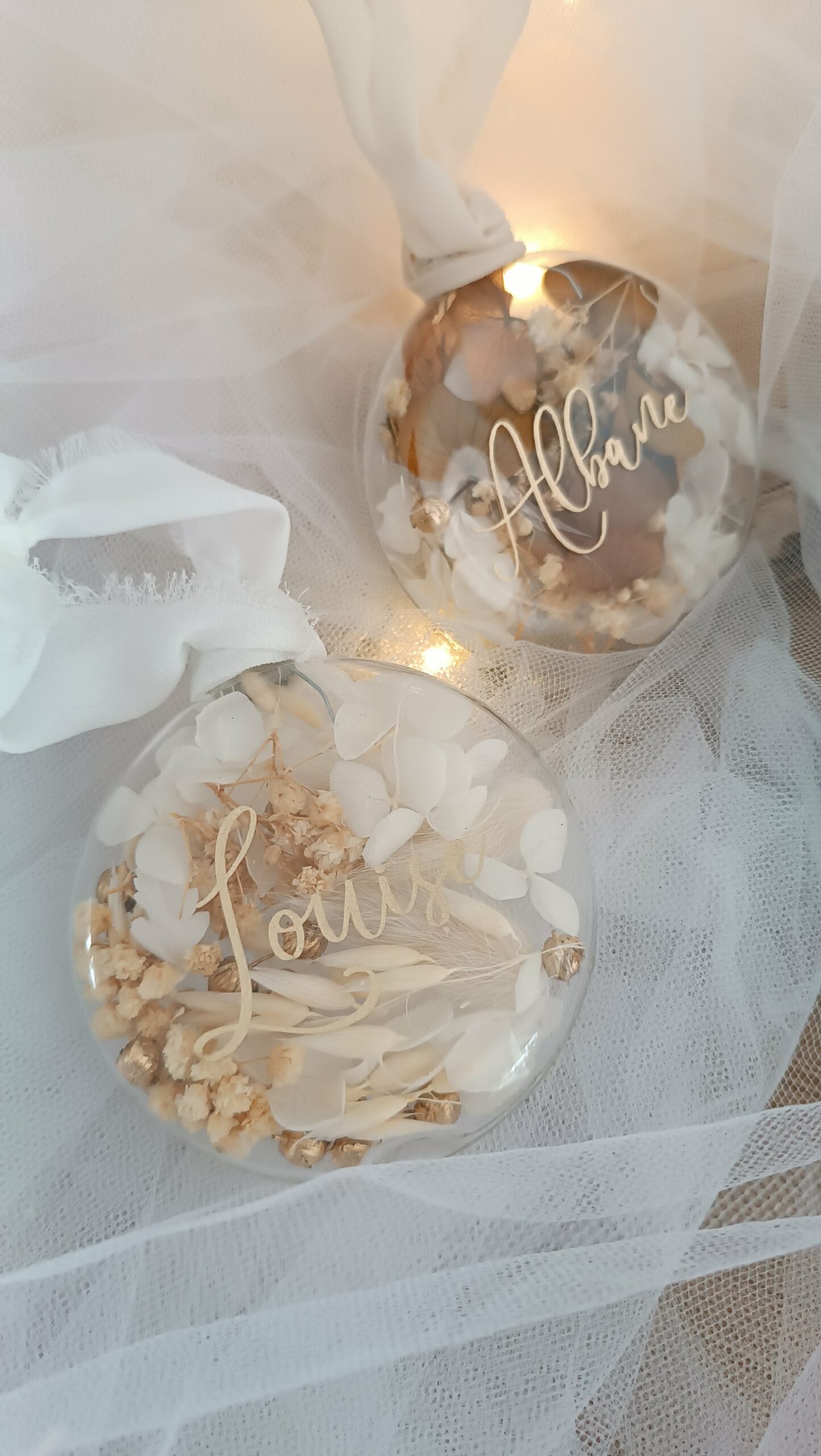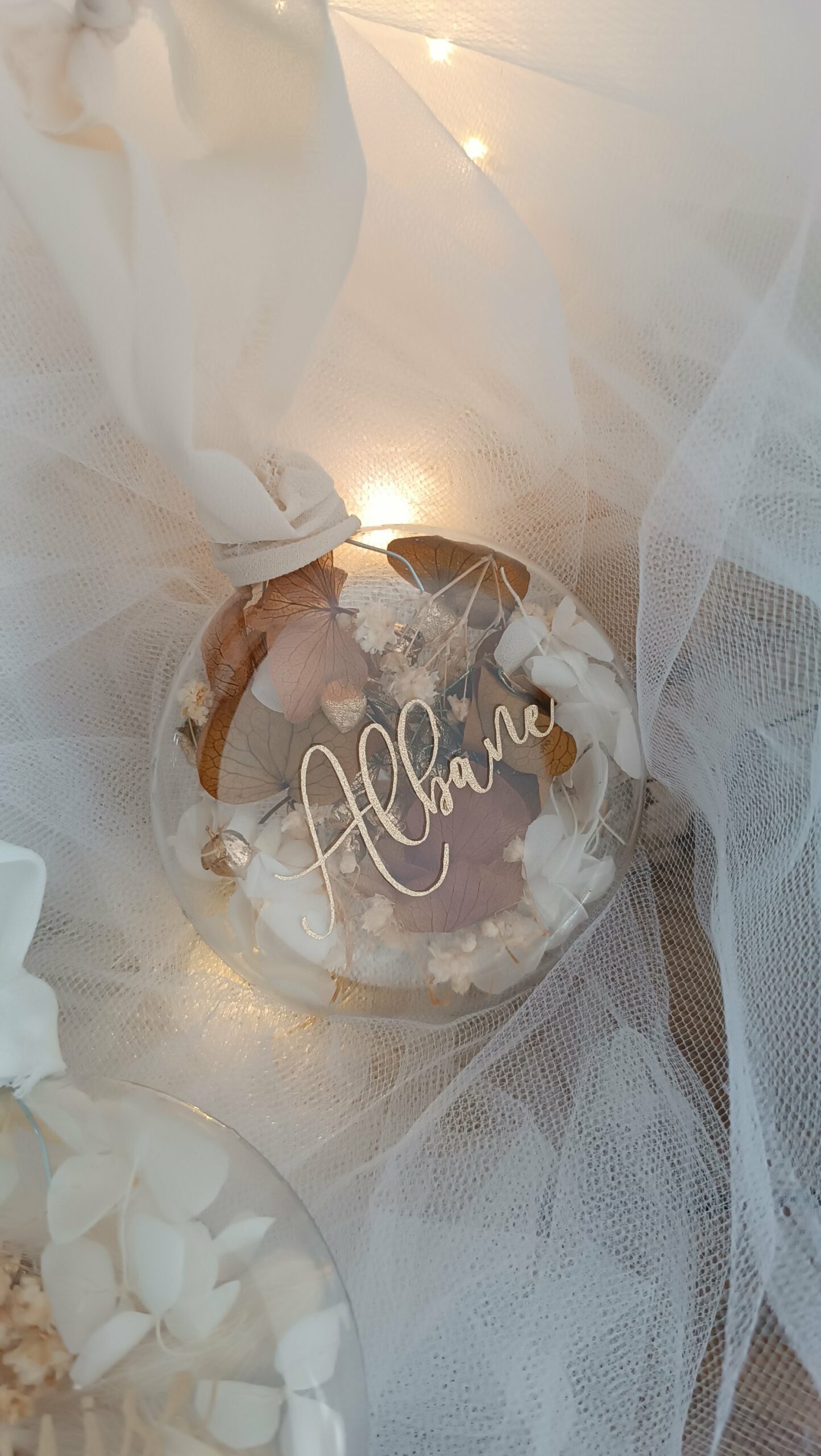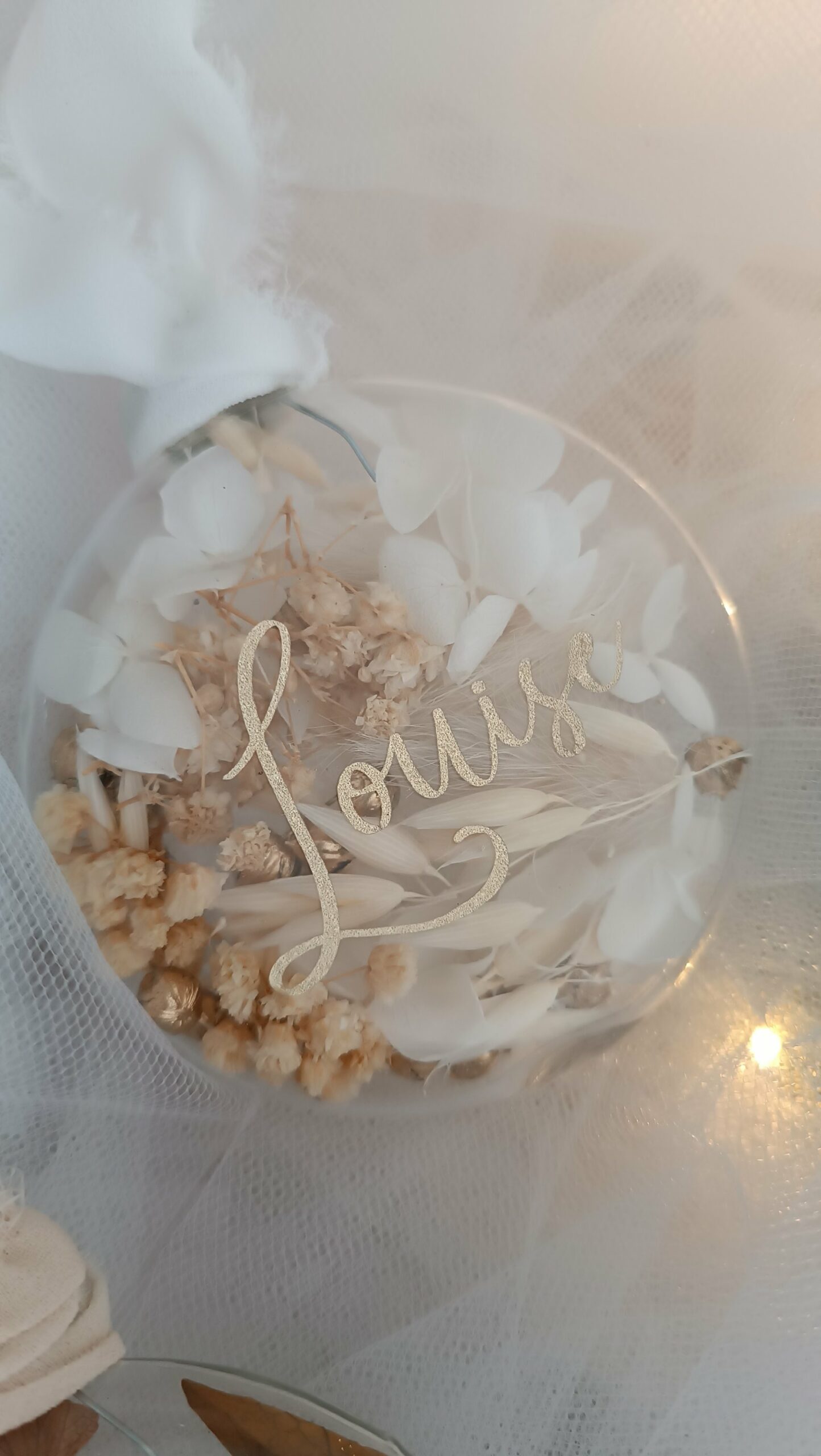 À l’intérieur, un délicat mélange de fleurs séchées naturelles, dans les couleurs de votre choix, compose une scène florale poétique. Le tout est sublimé par un prénom personnalisé – soigneusement apposé à l’intérieur de la boule – pour une décoration unique qui vous ressemble.