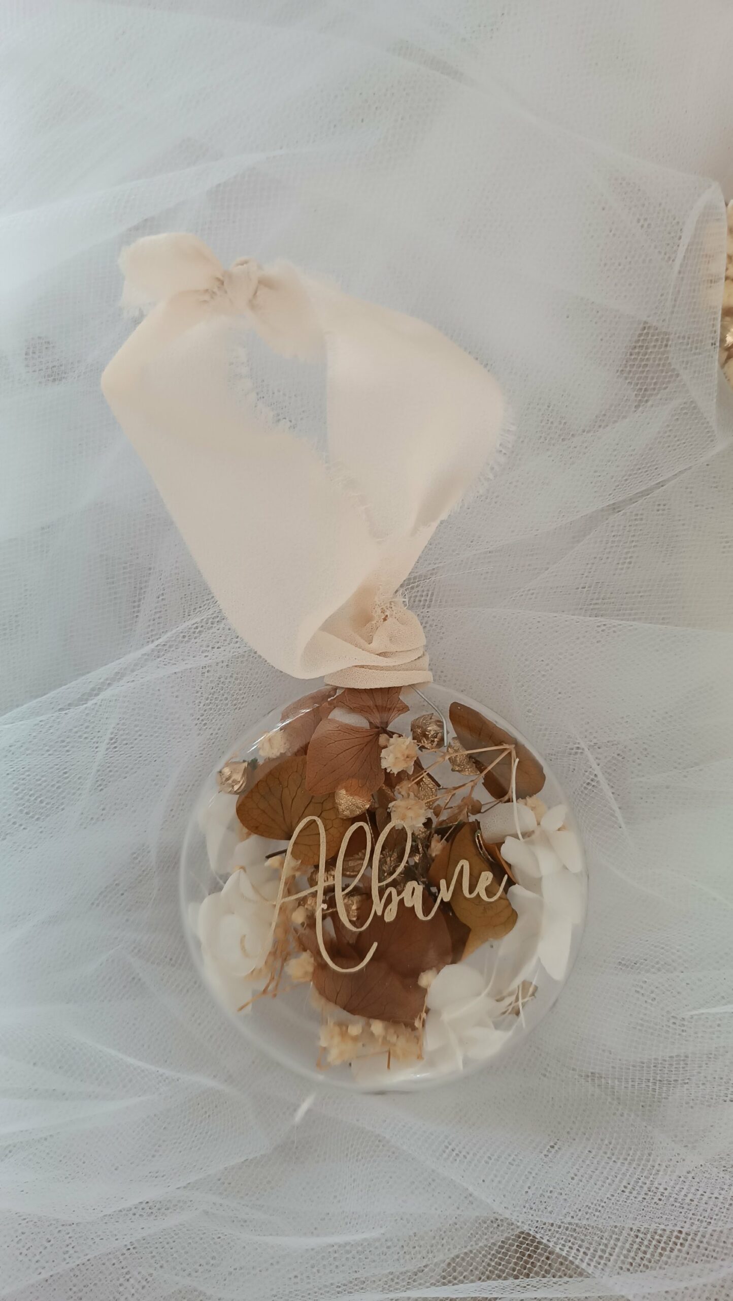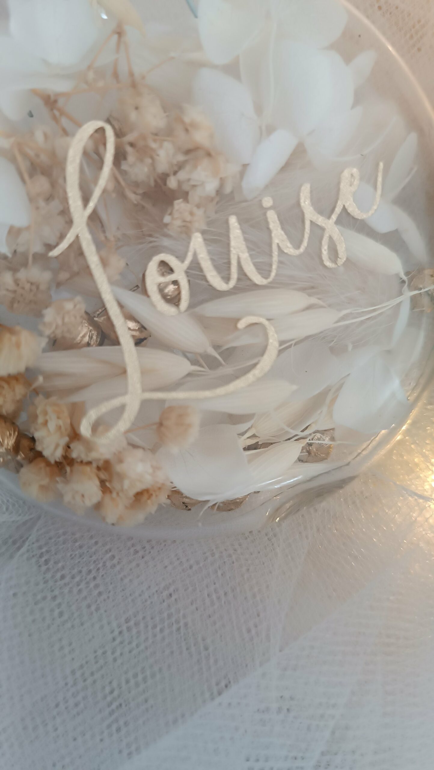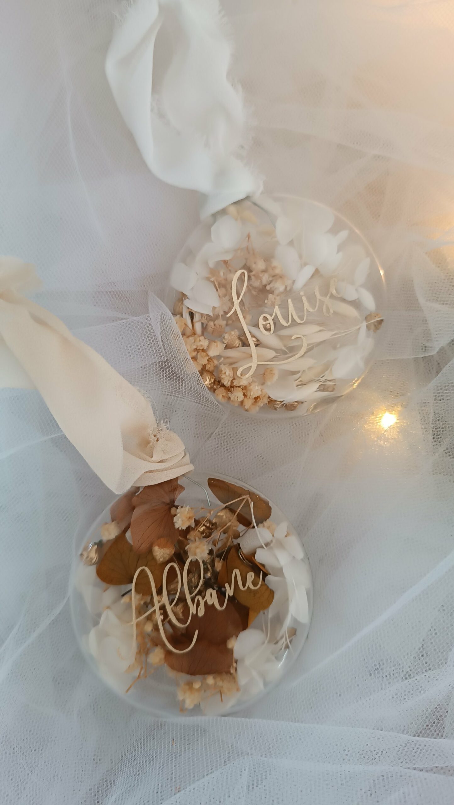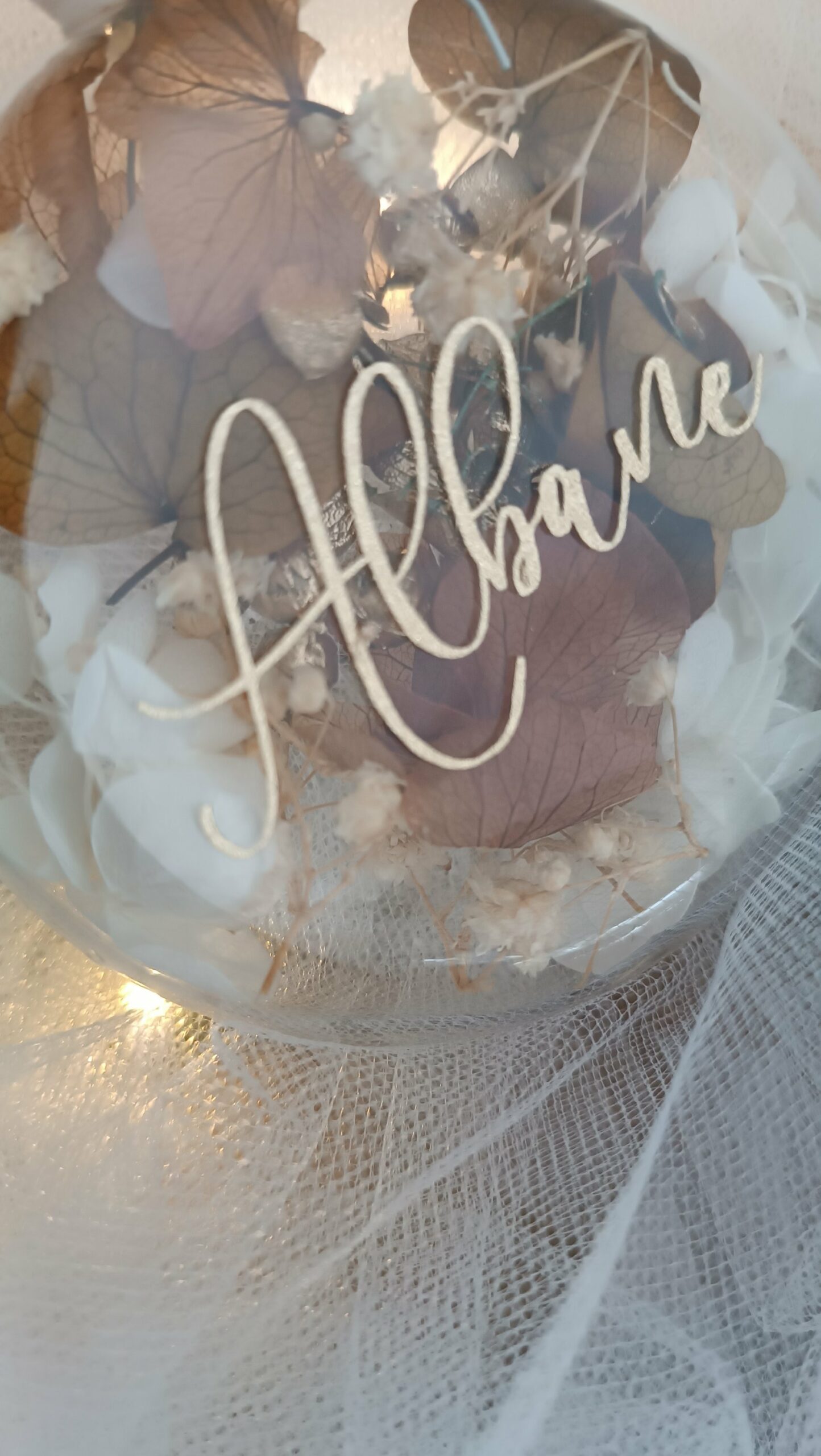 À l’intérieur, un délicat mélange de fleurs séchées naturelles, dans les couleurs de votre choix, compose une scène florale poétique. Le tout est sublimé par un prénom personnalisé – soigneusement apposé à l’intérieur de la boule – pour une décoration unique qui vous ressemble.
