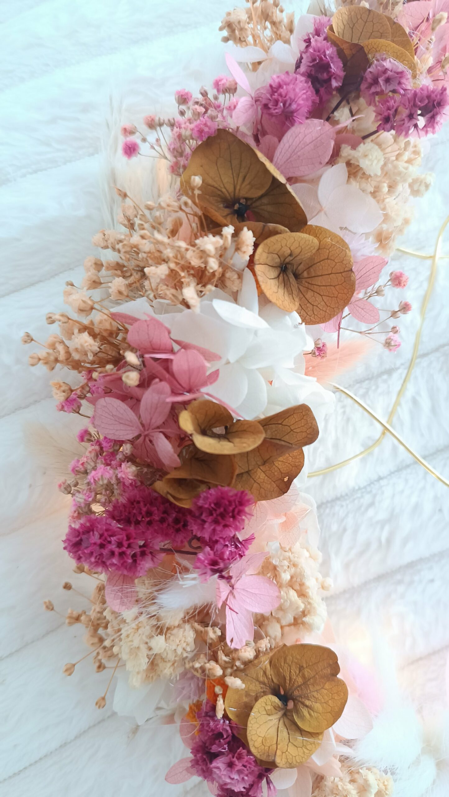Matériaux : cercle métal doré, fleurs séchées et stabilisées, fil de fer doré
