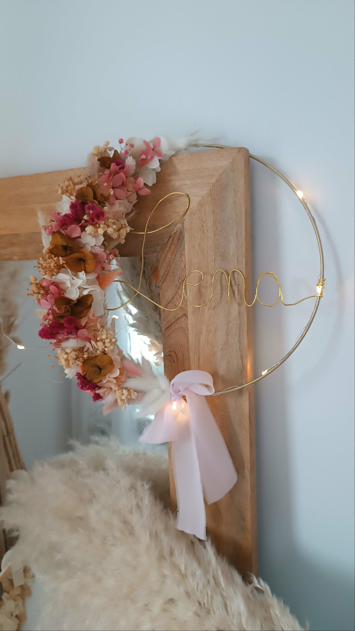 Cette couronne florale personnalisée est confectionnée avec soin sur un cercle en métal doré (disponible en 20 ou 25 ou 30 cm de diamètre), orné de fleurs séchées et stabilisées aux tons doux et naturels. Le prénom ou mot de votre choix est délicatement formé à la main en fil de fer doré, pour une touche élégante et personnelle.