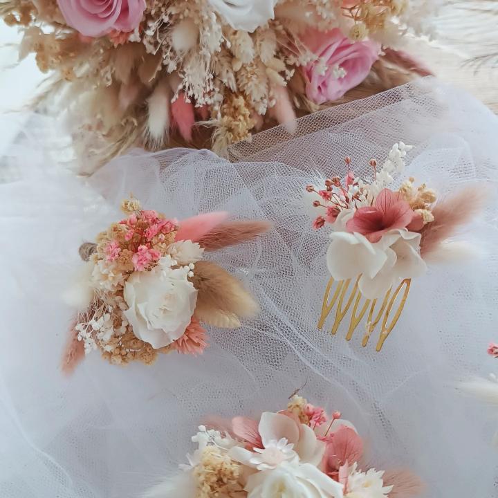 Fleurs Séchées de Haute Qualité : J’ utilise des fleurs séchées soigneusement sélectionnées pour leur beauté, leur durabilité et leur éclat. Ces fleurs naturelles apporteront une touche élégante et intemporelle à votre coiffure.