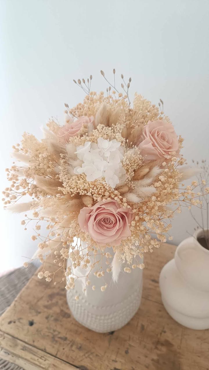 • Esthétique : Le bouquet en fleurs séchées apporte une touche bohème, romantique ou vintage, selon les choix de fleurs et de couleurs.