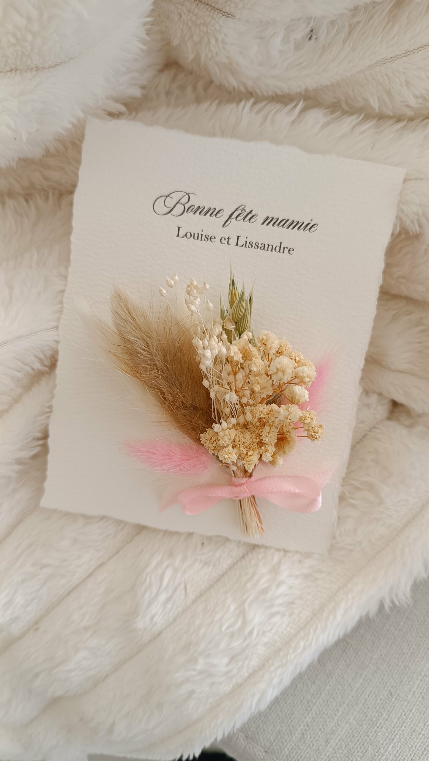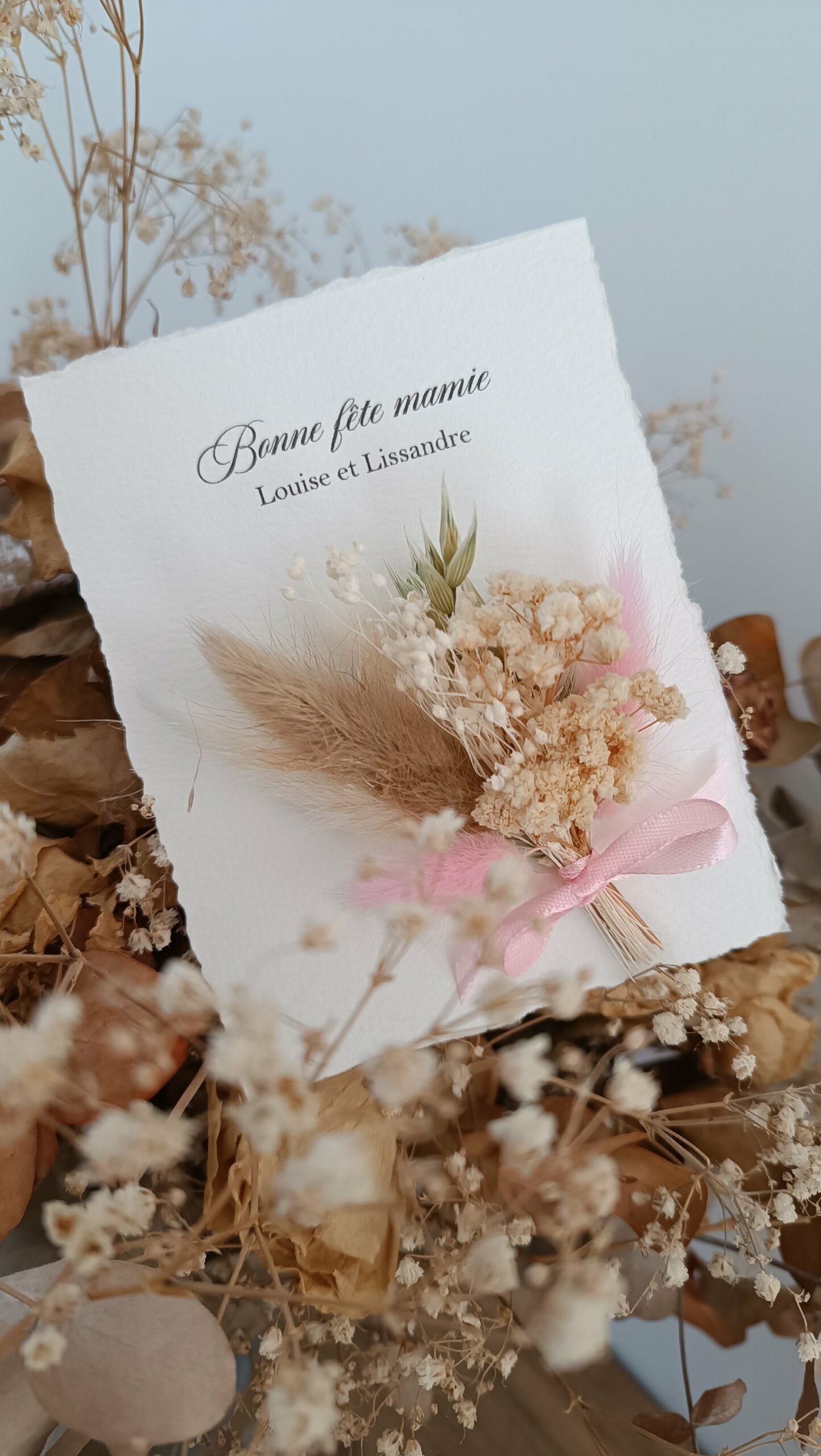 Sur le devant de la carte, un dessin raffiné accueille un vrai mini bouquet de fleurs séchées naturelles, assemblé à la main.